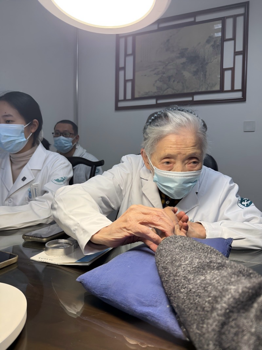 诊桌前的孙老,身形虽略有佝偻,精气神却十足,神情格外专注。她听得多,说得少,指尖搭在患者腕间时稳如磐石,目光落在患者脸上时专注有神,从舌苔气色到细微症状,从过往病史到饮食起居,问得细致,听得入心,连患者说话时不自觉攥紧衣角的小动作,都被她看在眼里。