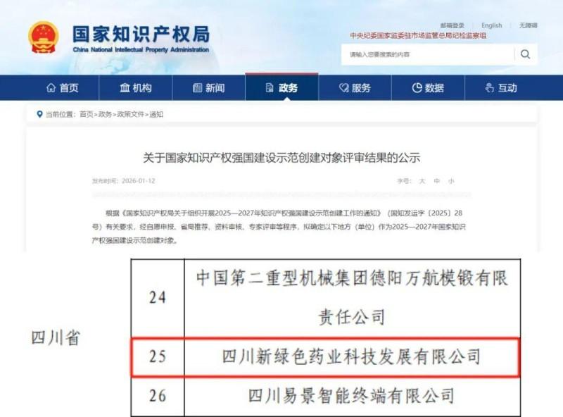 根据《国家知识产权局关于组织开展2025-2027年知识产权强国建设示范创建工作的通知》要求,历经多轮严格评审,新绿色药业凭借扎实的工作成果和突出的创新实力脱颖而出。