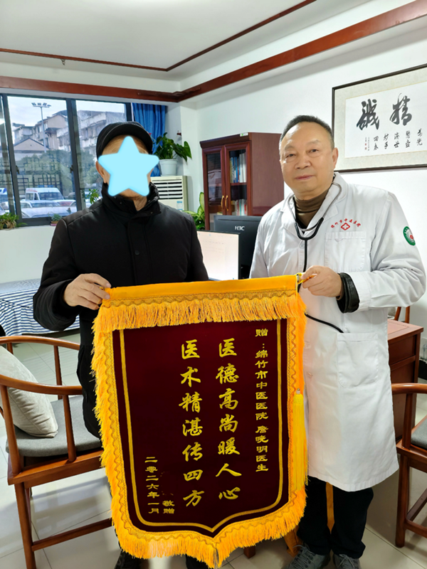 近日,年过七旬的杨爷爷在家人陪同下,将一面印有“医德高尚暖人心医术精湛传四方”字样的锦旗送到了绵竹市中医医院“全国基层名老中医药专家”、主任中医师詹晓明手中。锦旗虽轻,却承载着老人沉甸甸的感激。