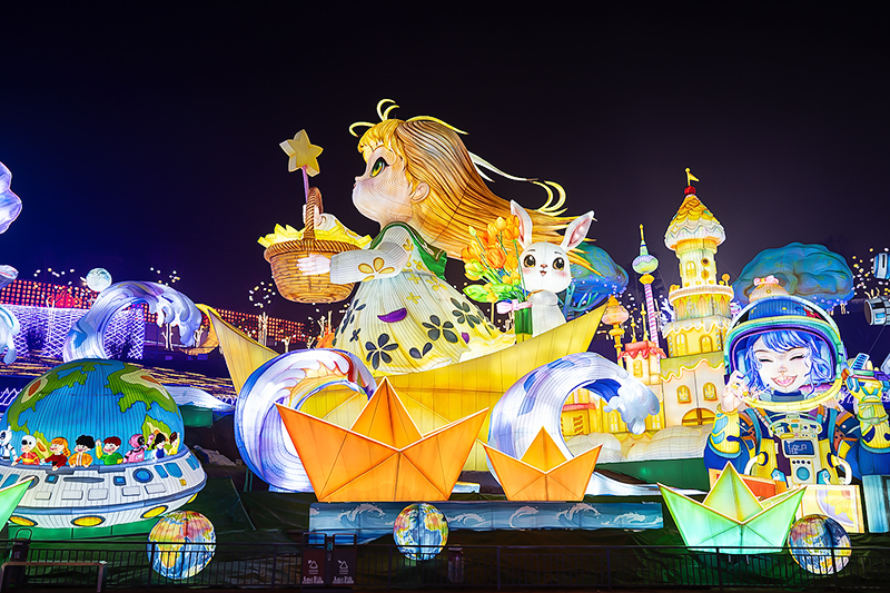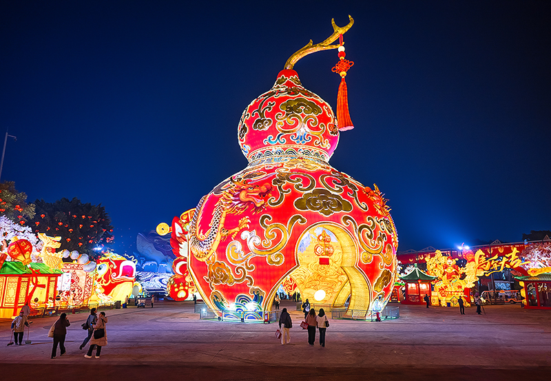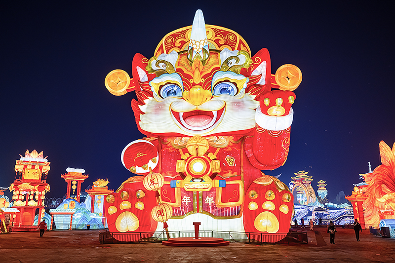 本届灯会以“灯绘华夏”为脉络,将彩灯、扎染、剪纸等非遗技艺与华夏神话史诗、经典历史故事深度结合,现场设“中国结大道”“福禄广场”“木兰传奇”“匠心非遗”“神奇华夏”等十大板块,以11组大型灯组与200余组中小型灯组,构筑起沉浸式的叙事空间,展现了一幅“万象共生”的艺术长卷。