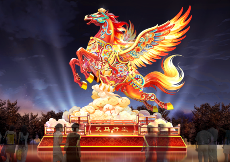 灯会大门以“天马+春樱仙境”为设计核心,将生肖马具象为带翼仙骥,搭配盛放的粉樱林,传递“祥瑞降春”的新春祈愿;“福运驰来”灯组以红金为主色调,神马昂首振翅,周身缀满传统吉祥纹样,踏云而立的造型承载“马到成功、前程似锦”的美好寓意。此外,连续两年“亮相”绵阳新春灯会的芙蓉仙子,今年将以组团形式融合传统文化元素换装归来,同时引入科技赋能,让灯组可以拟人化互动、智能对话、智能合影,让“观灯”变为“玩灯”。