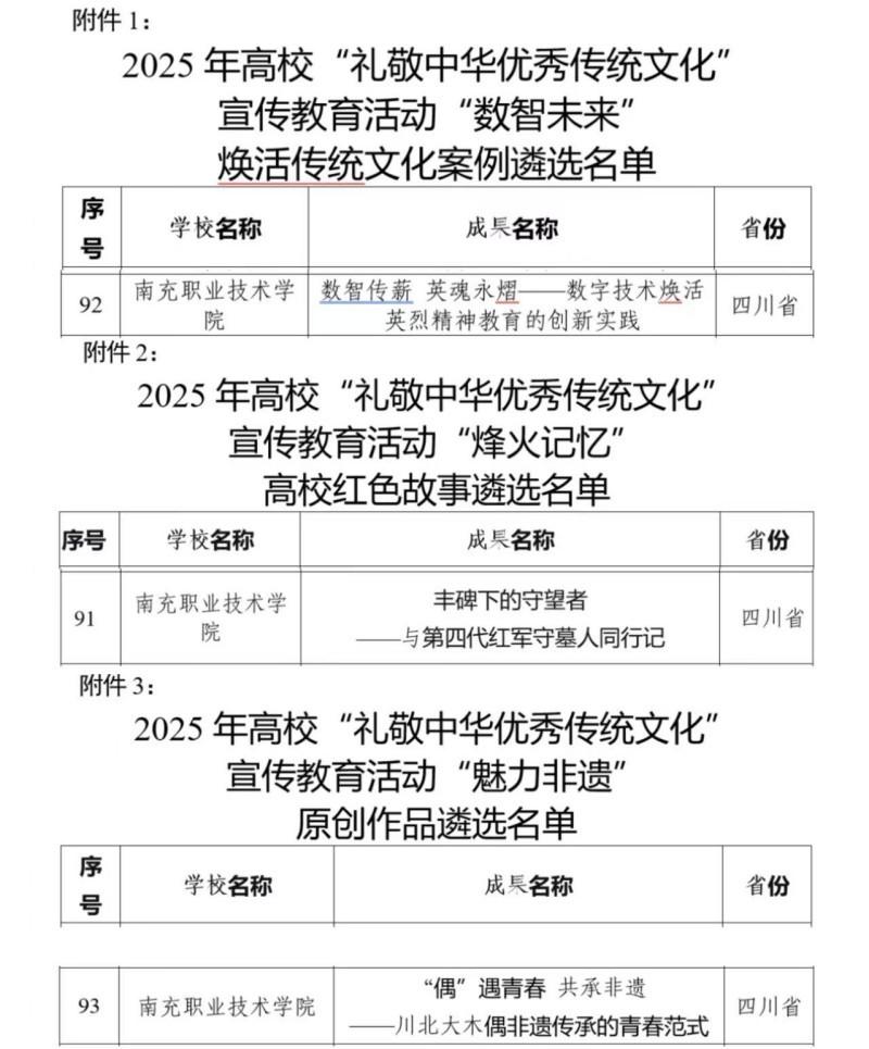 1月19日,教育部思想政治工作司发布《关于2025年高校“礼敬中华优秀传统文化”宣传教育活动结果的公示》,南充职业技术学院(南职)共3件作品入选名单。