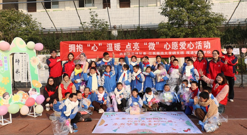 这场主题为“拥抱‘心’温暖,点亮‘微’心愿”的公益爱心助学活动,由前锋团区委统筹协调,江苏师范大学研究生支教团策划执行,观塘镇小学校和代市中学共同配合。