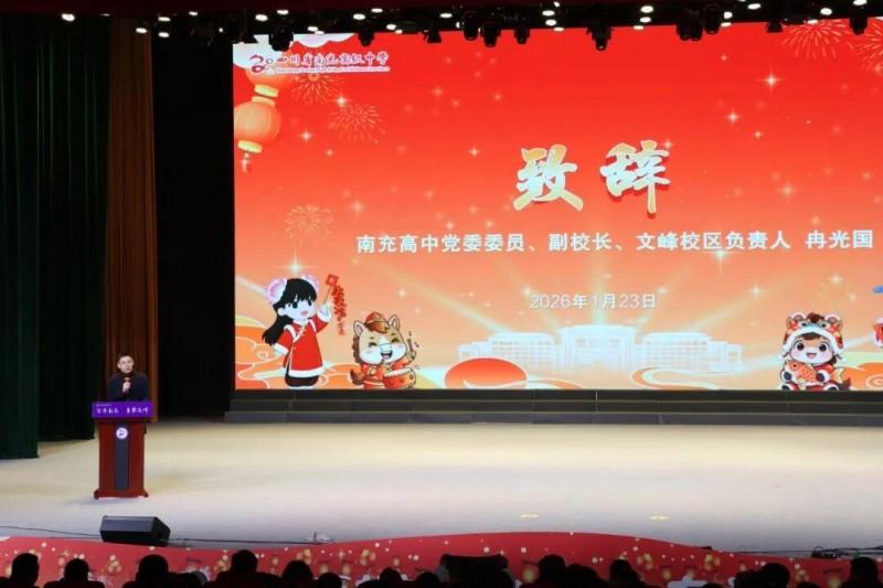 活动现场,南充高中党委委员、副校长冉光国,向到场的全体老师、家长及同学致以热忱问候。他在致辞中说,这场“少年攀文峰·素养汇星河”的散学礼,是“文宝莲娃”们一学期的成长诗行,是全学段“三融并进,五措并施”的答卷,更是家校携手织就的温暖星河。最后,冉光国向全体师生及家长送上饱含诚意的马年祝愿。