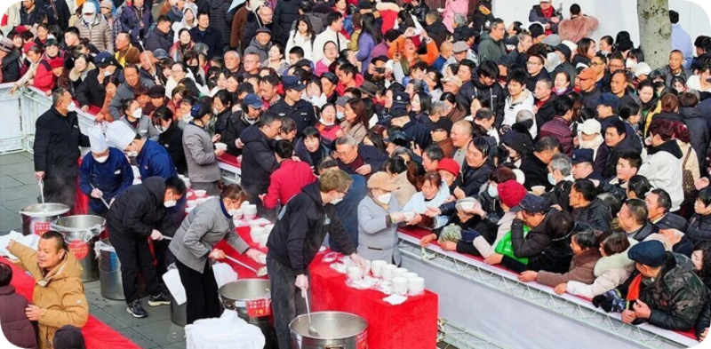 当天上午,古城张飞广场和贡院广场早早就挤满了等待的市民和游客。当热气腾腾的免费腊八粥送到人们手上,大家就像享受到香气扑鼻的美味佳肴,赞不绝口。