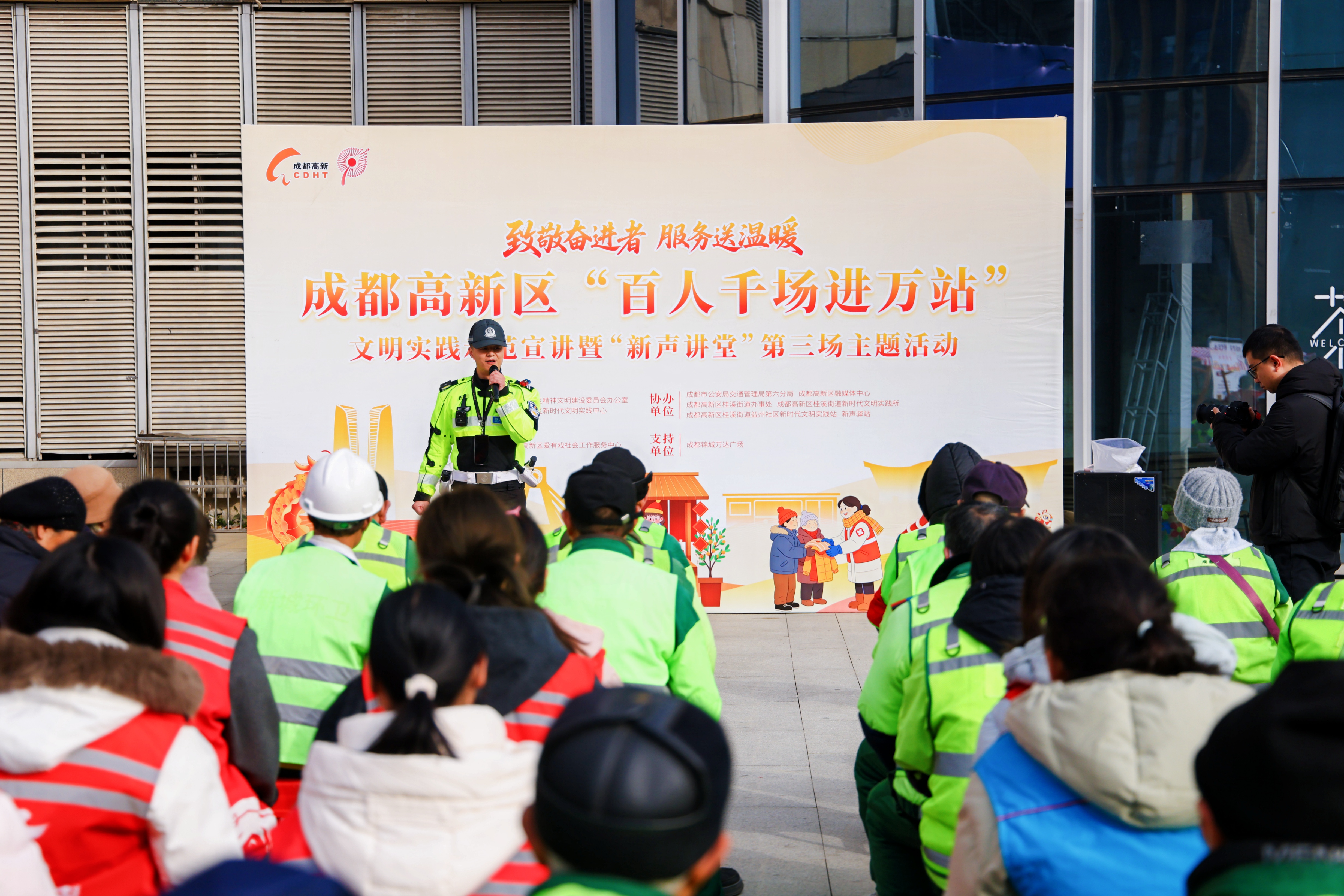 1月26日农历腊八节,成都高新区“新声驿站”旁暖意融融,成都高新区“百人千场进万站”文明实践示范宣讲暨“新声讲堂”第三场主题活动在这里举行。活动围绕“致敬奋进者服务送温暖”主题,将新思想、民俗味与文明风送到群众身边,320余名户外劳动者、园区职工、企业商家、青年志愿者、社区网格员、居民代表热情参与,致敬城市奋进者,共同营造文明祥和、温暖向上的良好氛围。