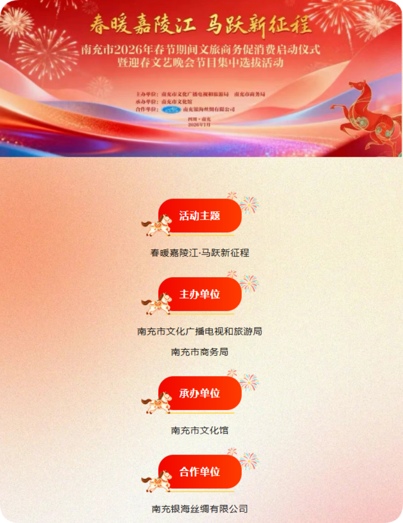 马上入川,南充过年。嘉陵江畔年味浓,龙马欢腾迎新春,南充市2026年春节期间文旅商务促消费启动仪式暨迎春文艺晚会节目集中选拔活动,将于1月29日15:00在南充大剧院举行。