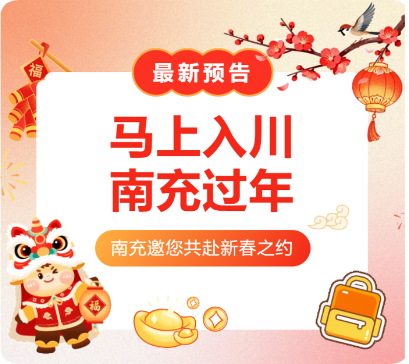 为市民游客呈现“天天有活动、场场都精彩”新春文旅盛宴,诚邀八方宾朋齐聚南充,过有戏的文艺年、沸腾的烟火年、地道的原乡年。