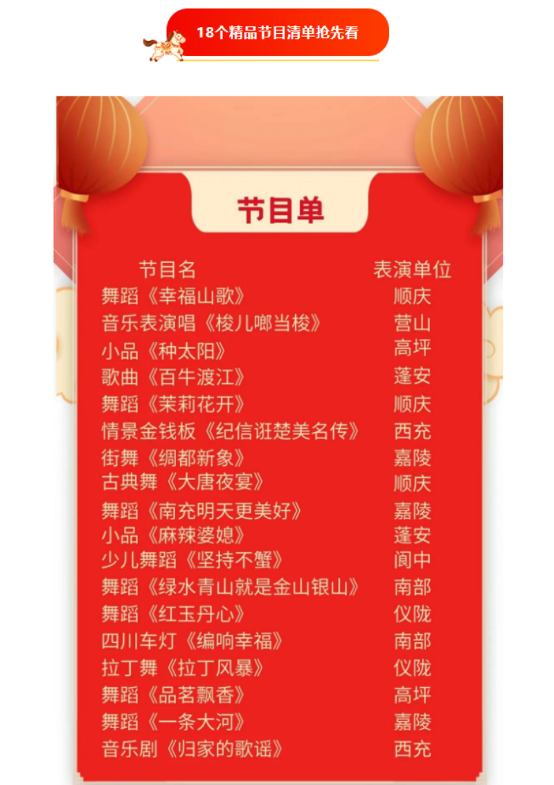 18个精彩节目将在大剧院轮番登场,节目涵盖舞蹈、小品、音乐剧等多元艺术形式。从《幸福山歌》的欢快旋律拉开序幕,到《归家的歌谣》的温情曲调圆满收尾,顺庆、高坪、阆中等地文艺单位同台献艺、联袂演绎,为市民献上一台饱含川东北特色、年味十足的视听盛宴!