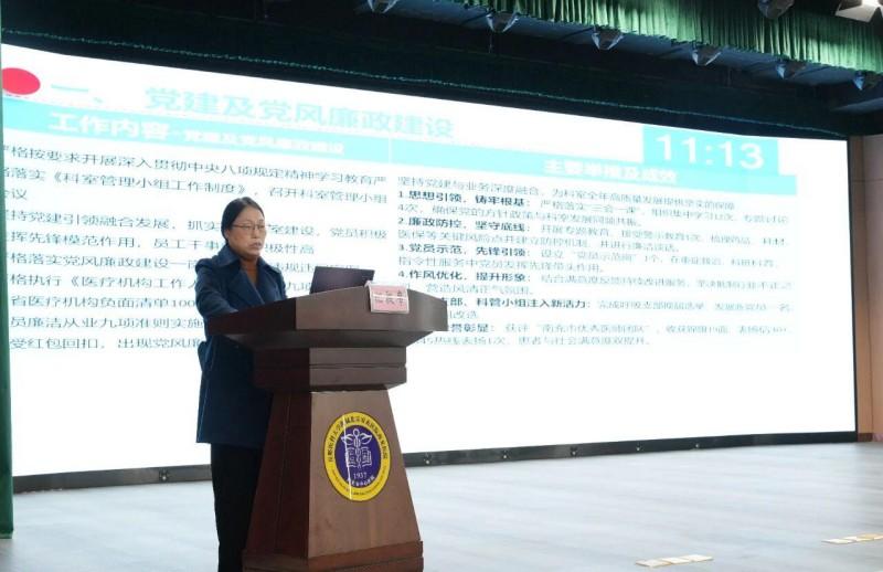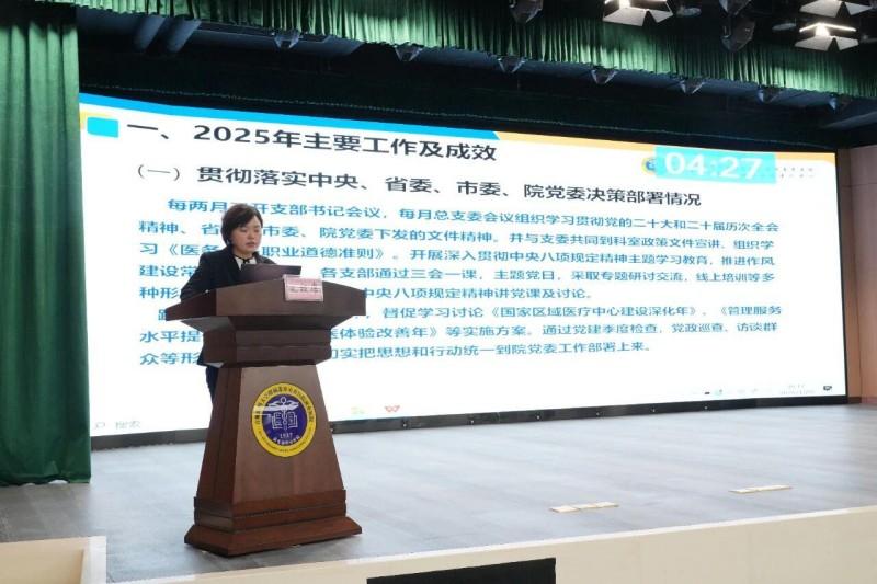 抽选7个临床科室和两个党总支进行集中述职。他们结合PPT演示,图文并茂地展示2025年在医疗技术、服务质量、科研教学、人才培养、党建工作等方面取得的突破性进展以及2026年工作计划。述职内容聚焦数据与实例,既亮出成绩单,也不回避问题与短板,做到务实求真。
