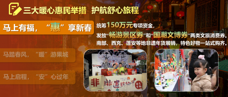 2月18日起,马上有福,“惠”享新春,统筹150万元专项资金,发放“畅游景区券”和“国潮文博券”两类文旅消费券。南部、西充、蓬安等地非遗年货展销,特色好物一站式购齐。