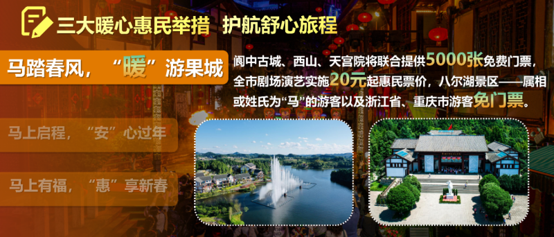 马踏春风,“暖”游果城。阆中古城、西山、天宫院将联合提供5000张免费门票,剧场演艺实施20元起惠民票价,八尔湖景区——属相或姓氏为“马”的游客以及浙江省、重庆市游客免门票。