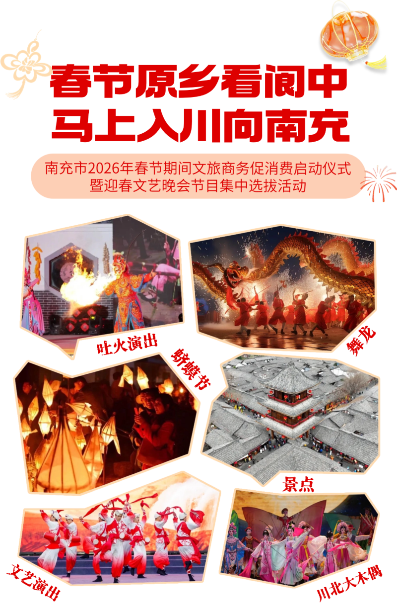 为市民游客呈现“天天有活动、场场都精彩”新春文旅盛宴,诚邀八方宾朋齐聚南充,过有戏的文艺年、沸腾的烟火年、地道的原乡年。