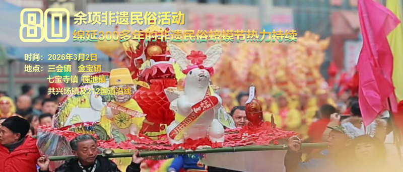 3月2日(正月十四),在三会镇、金宝镇、七宝寺镇、莲池镇、共兴场镇及212国道沿线,开展非遗民俗活动——蛴蟆节。