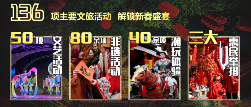 这个春节,南充市文广旅局精心策划了136项新春特色文旅活动,50余项文艺活动轮番登场、80余项非遗活动点亮年味、40余项潮玩体验新鲜上线,还有三大暖心惠民举措,从即日起持续至3月,陪大家热热闹闹过大年。