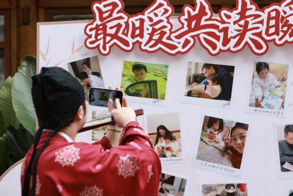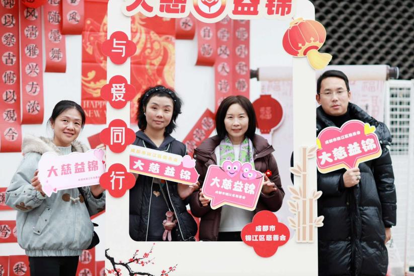 踏入活动现场,仿佛穿越古今交融的时空隧道。4大核心IP打卡点与6家街区联动点位巧妙融合。交子文化、锦官驿古驿道风情与新春元素,处处皆是惊喜。“交子诗韵·IP核心”区里,交子文化宣传牌搭配诗词手牌、文创折扇,随手一拍便是国风大片;“锦官驿新春·IP共生”区的红灯笼阵喜气洋洋,福字墙上写满邻里祝福,孩童踮脚贴心愿,长者围坐话家常,暖意融融;“锦江雅韵·全民阅读”区的本土诗词展板与主题书籍整齐排列,吸引居民驻足吟诵;“亲子共读·IP传承”区的温馨照片,定格着陪伴的美好瞬间。不仅如此,在锦江区慈善会的大慈益锦打卡区前,吸引了数个亲子家庭的爱心打卡合影留念。更有街区联动打卡点福利不断,居民到合作商户打卡即可领取折扣券与小礼品,集章之路满是意外之喜。