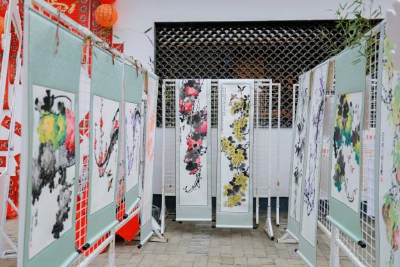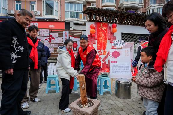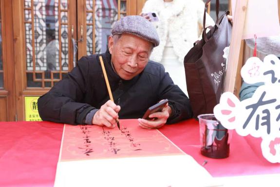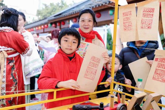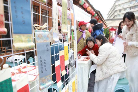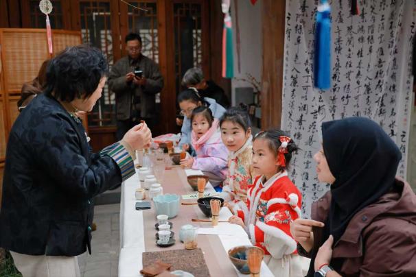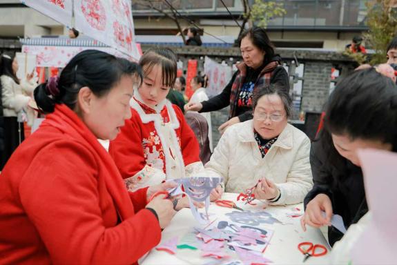 互动体验区里,指尖创意传递文化温度。交子拓印摊位前,居民跟着老师学习古老技艺,在白纸上印下清晰的交子图案,写下“邻里互助”“新春吉祥”的信义寄语;掐丝珐琅,让精美的传统文化艺术走进大家的生活场景;茶艺诗歌区,盖碗茶香四溢,大家品味《七碗茶诗》的意境,学习宋代点茶技艺,感受“以茶为信”的传统礼仪;新春诗笺区,公益书法老师手把手指导亲子协作,“福满人间”“诗意新春”等字样跃然纸上;琴棋书画四大区域里,居民或挥毫泼墨,或对弈沉思,或轻拨琴弦,完成互动还能参与诗词配对赛。