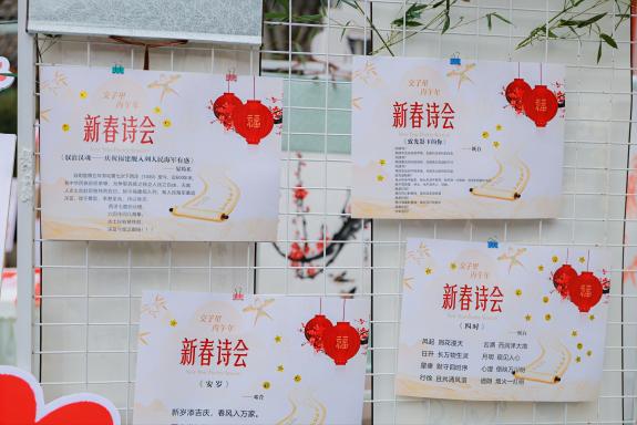 自然与诗意的碰撞同样精彩。自然拼贴诗创作中,大家用落叶、树枝、果壳搭配回收旧纸张,剪贴出“春风拂绿柳,邻里乐融融”“环保护家园,新春启新篇”等独特作品;诗歌种子纸环节,居民将嵌有植物种子的可降解纸张栽种进花盆,让诗意与希望一同发芽;二十四节气诗歌竹筒里,一张张节气诗卡片可供抽取留念,环保竹筒让文化传承更具可持续性;废布缝制摊位上,废旧布料变身印着“环保”字样、诗句或新春图案的手作,传递着“慢生活、共守护”的社区理念。此外,文明棒棒糖游戏区里,小朋友答对诗词就能获得甜蜜奖励,真人熊猫玩偶陪拍、年画展示等环节,让文明新风在欢乐中传递。