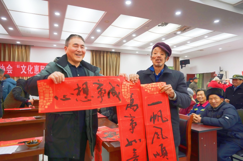 活动现场,书法家们支起长桌,挥毫泼墨写下“五谷丰登”“家和业兴”等带着浓浓年味的春联和福字,墨香四溢间,一幅幅春联成了村民家门口最红火的年景。