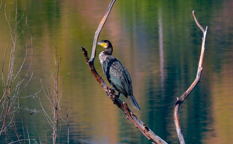 清晨时分,薄雾轻笼水面,鸬鹚的身影早已遍布水库。它们或成群结队在水面盘旋,或停栖在岸边树枝上晾晒翅膀。因尾脂腺不发达,羽毛防水性较差,潜水捕鱼后的鸬鹚总会舒展双翅,在晨光中晒干羽翼。