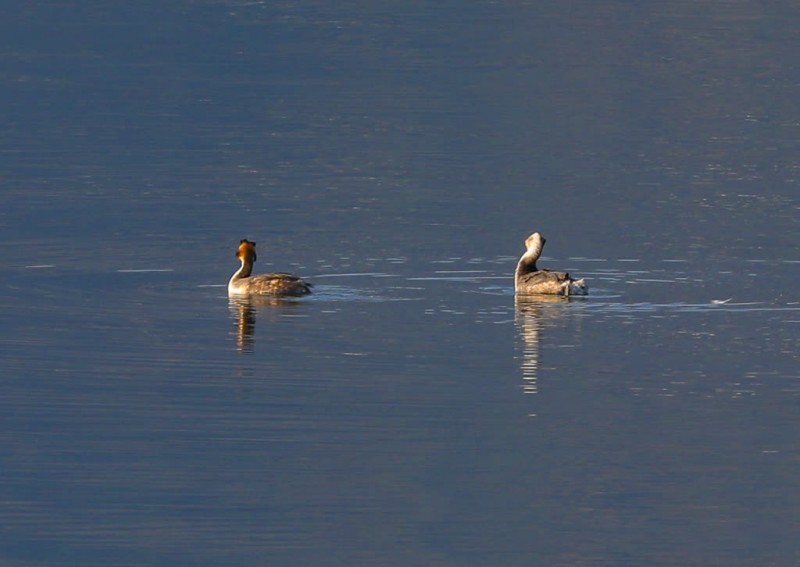 凤头鸊鷉顶着标志性的冠羽,成双成对地游弋,时而低头潜入水中觅食,时而浮出水面梳理羽毛。潜水能力极强的它们,能在水下停留十余秒,精准捕捉小鱼。