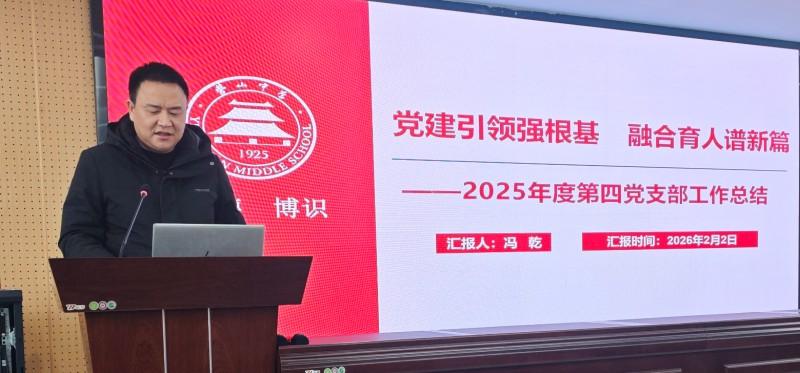 第四党支部书记冯乾围绕思想引领、组织基础、党建融合等内容,分享党员带头家访、上示范课、培优补差等经验,剖析理论学习、党建特色等不足并明确下一步计划。