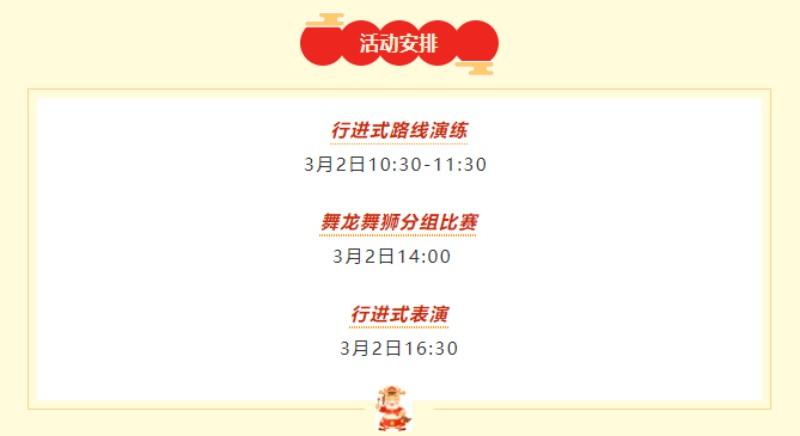 活动主题:“龙狮闹新春欢喜过大年”;活动时间:2026年3月2日(正月十四);活动地点:高坪区万达广场(高坪区江东大道三段);主办单位:南充市文广旅局、高坪区人民政府;承办单位:南充市文化馆、高坪区文广旅局。