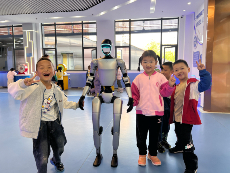 在科普基地讲解员的耐心引导下,探索之旅正式拉开序幕。孩子们的目光被馆内琳琅满目的趣味科技展品牢牢吸引,一个个瞪大好奇的眼睛认真聆听讲解。当灵活的机器人和憨态可掬的机器狗登场时,现场瞬间响起阵阵欢呼。孩子们不仅近距离观察了智能设备的灵动姿态,还勇敢地伸出小手与机器人亲切握手,见证机器狗随着音乐节拍灵活跳舞的奇妙场景,欢声笑语在展厅中久久回荡。讲解过程中,讲解员用通俗易懂的语言将复杂的科学知识转化为趣味问答,充分调动了孩子们的探索热情。