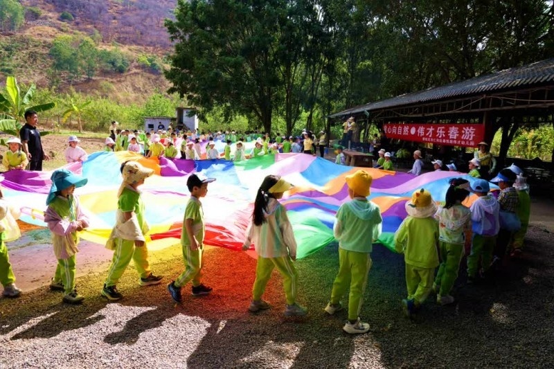 色彩缤纷的彩虹伞游戏中,大家共同拉着伞檐,让彩虹伞在空中起伏翻飞,时而如波浪涌动,时而似花朵绽放,在五彩斑斓中享受集体游戏的快乐。清风从耳畔掠过,欢快的尖叫声、爽朗的欢笑声,久久回荡在农场的上空。