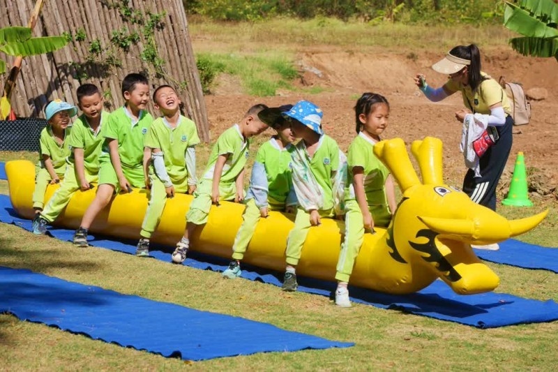 “一二、一二……”农场空地上,呐喊声、加油声此起彼伏,一场充满童趣的“旱地赛龙舟”火热开赛。孩子们分组蹲坐“龙舟”,双手紧握把手,齐心协力、步调一致向前冲,稚嫩小脸上满是认真,在你追我赶中感受团结协作的力量。