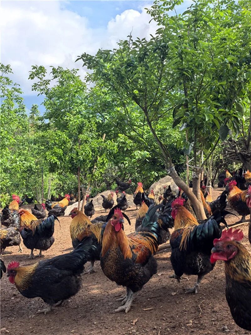 占地370亩的山坡上,黄果柑树和枇杷树错落分布。午后阳光透过树叶,斑驳地洒在奔跑的鸡群身上。每一只鸡都体格雄健,羽毛泛着金属般的光泽。它们成群结队穿梭于林间,啄食地上的嫩草。